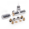 Rechtes thermostatisches Eck-Mittelset enthält: ein thermostatisches Ventil, ein Absperrventil, einen thermostatischen Kopf SLIM, Adapter AL-PEX ∅ 16x2 und Kupfer ∅ 15.