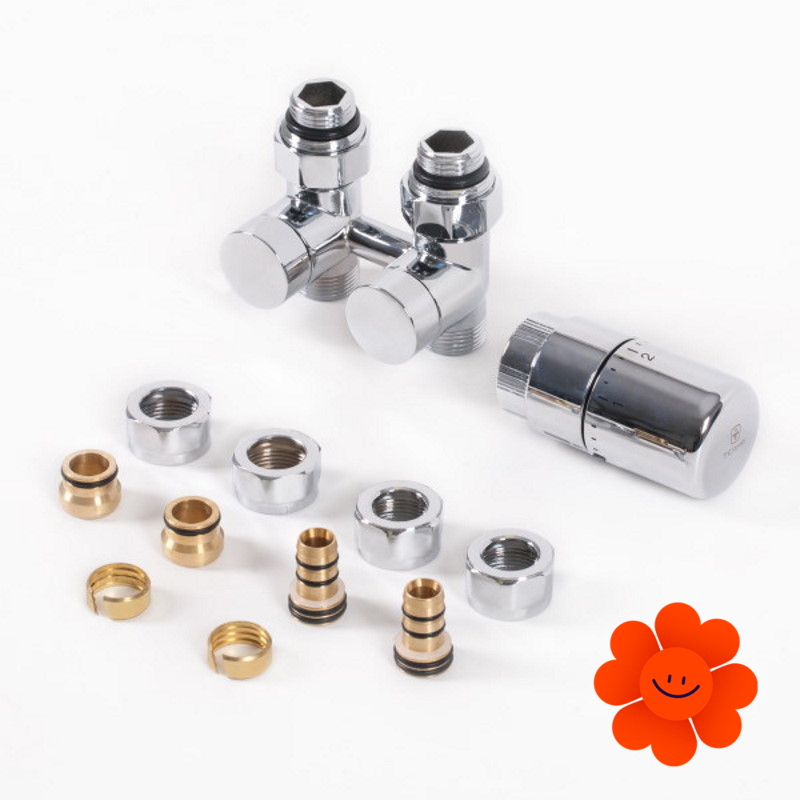 Das thermostatische direkte Mittelset enthält: ein thermostatisches Ventil, ein Absperrventil, einen thermostatischen Kopf SLIM, Adapter AL-PEX ∅ 16x2 und Kupfer ∅ 15.