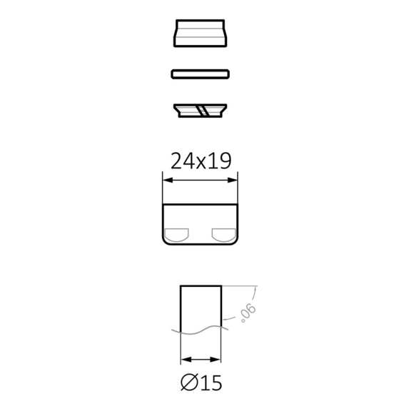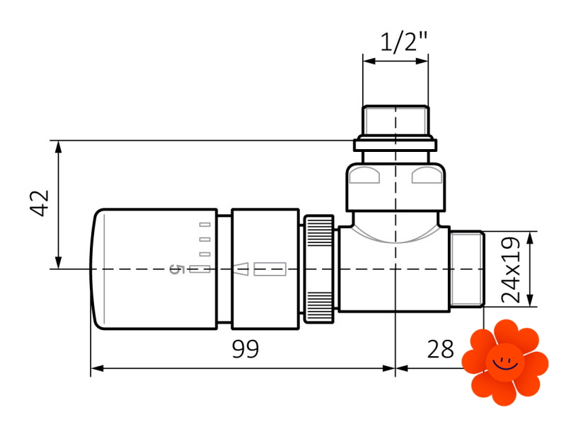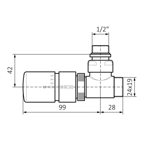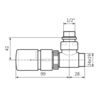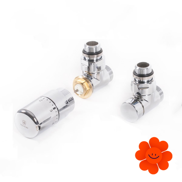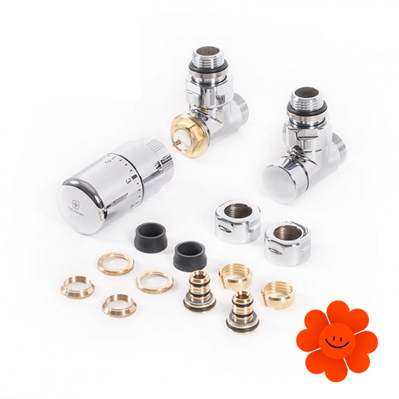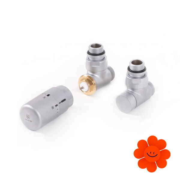 Thermostatisches Design-Eckventilset enthält: ein thermostatisches Ventil, ein Absperrventil, einen thermostatischen Kopf SLIM, Adapter AL-PEX ∅ 16x2 und Kupfer ∅ 15.