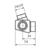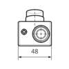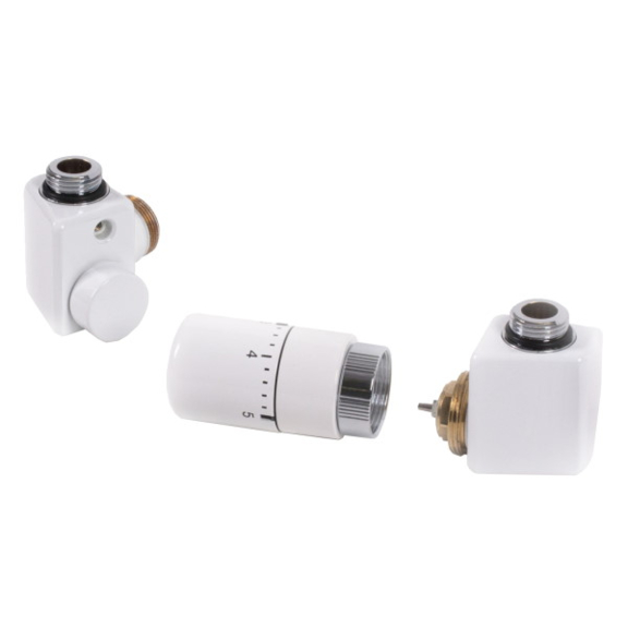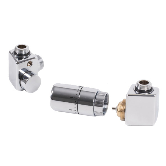 Linkes thermostatisches Winkelset enthält: ein thermostatisches Ventil, ein Absperrventil, einen thermostatischen Kopf SLIM, Adapter AL-PEX ∅ 16x2 und Kupfer ∅ 15.