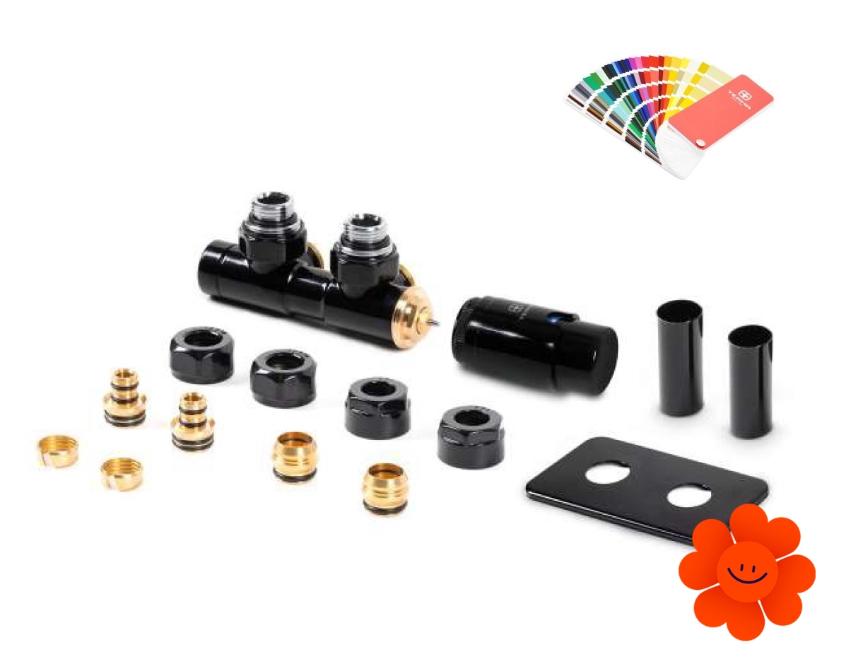 Thermostatisches Design-Eck-Mittelset der Marke Terma mit einer wählbaren maßgetreu hergestellten Farbausführung, dank der man das Set zu einem beliebigen Heizkörper oder einem anderen Zubehör anpassen kann.