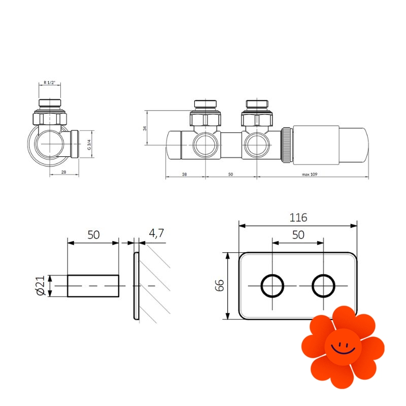 • Anschlussgewinde am Heizkörper: G 3/4", mit Adapter G1/2"