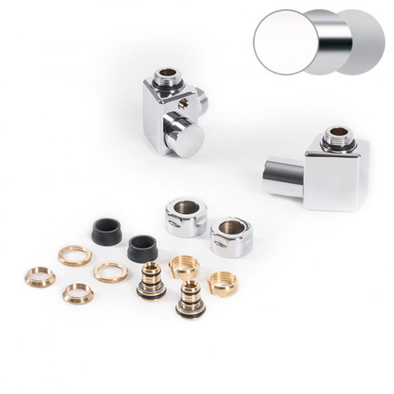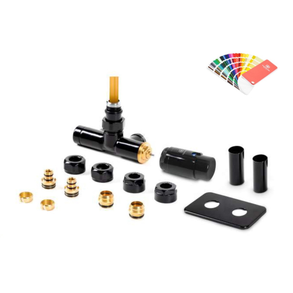 Thermostatisches Design-Eck-Mittelset der Marke Terma mit einer wählbaren maßgetreu hergestellten Farbausführung, dank der man das Set zu einem beliebigen Heizkörper oder einem anderen Zubehör anpassen kann.