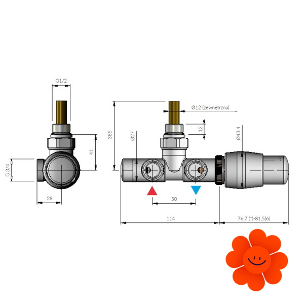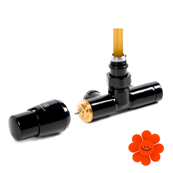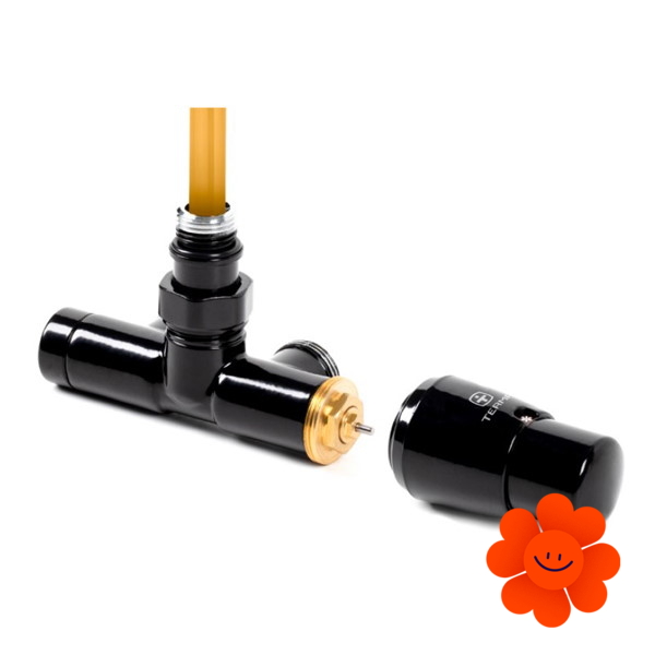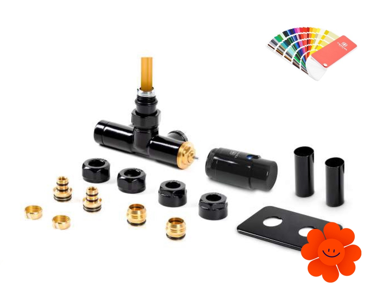 Thermostatisches Eck-Mittel-Design-Set mit einer Lanze Marke Terma mit einer wählbaren maßgetreu hergestellten Farbausführung, dank der man das Set zu einem beliebigen Heizkörper oder einem anderen Zubehör anpassen kann.