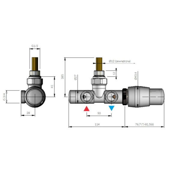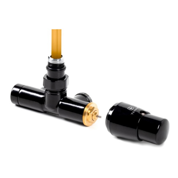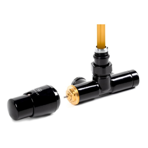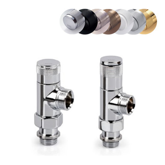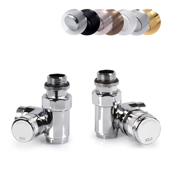 Thermostatisches Eck-Mittel-Design-Set mit einer Lanze Marke Terma mit einer wählbaren maßgetreu hergestellten Farbausführung, dank der man das Set zu einem beliebigen Heizkörper oder einem anderen Zubehör anpassen kann.
