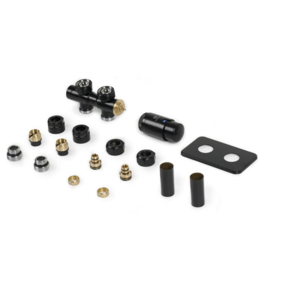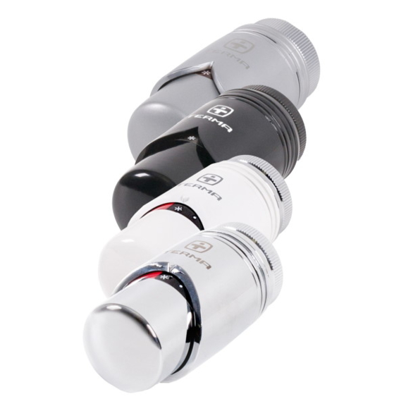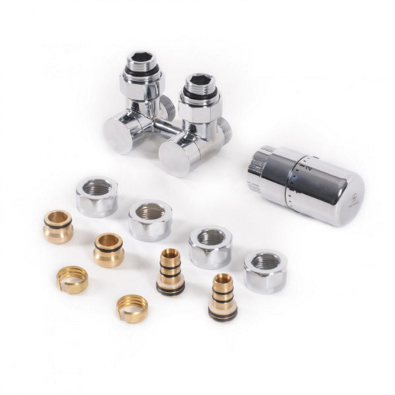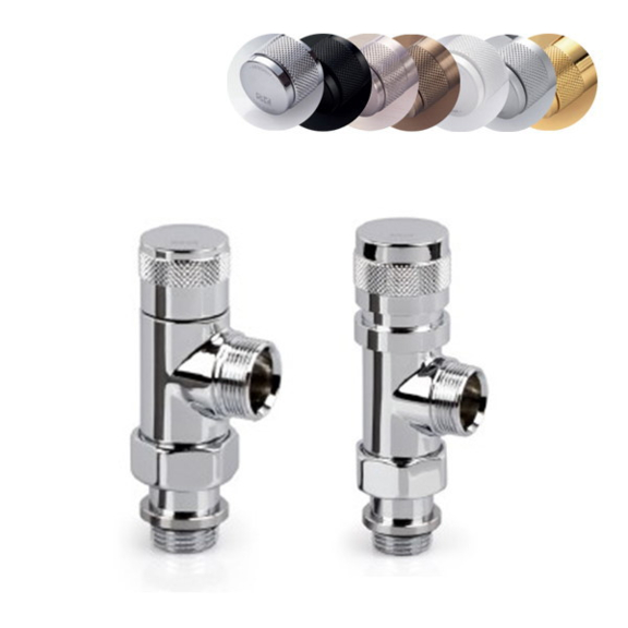 Thermostatisches Design-Winkelset der Marke Terma mit einer wählbaren maßgetreu hergestellten Farbausführung, dank der man das Set zu einem beliebigen Heizkörper oder einem anderen Zubehör anpassen kann.