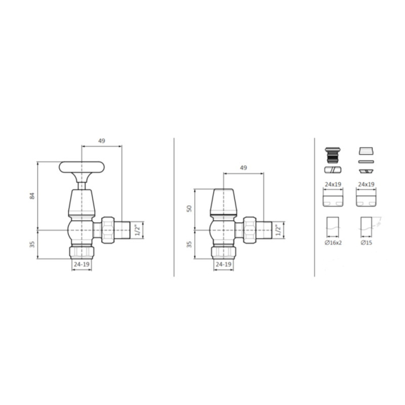 Das manuelle Designset enthält: Regelventil, Abschlussventil, Adapter AL-PEX ∅ 16x2 und Kupfer ∅ 15.
