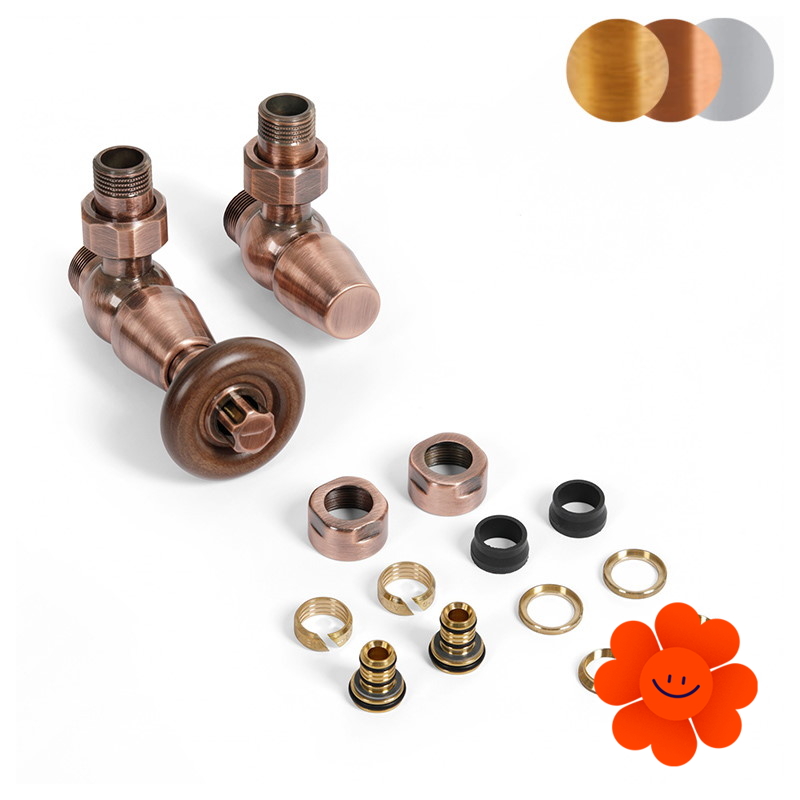 Das thermostatische Designeckset enthält: thermostatisches Ventil, Abschlussventil, Adapter AL-PEX ∅ 16x2 und Kupfer ∅ 15.