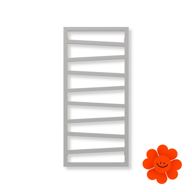 Ein moderner Heizkörper aus zueinander ausgerichteten Vierkantrohren. Die flache Form mit asymmetrisch angeordneten Profilen zieht die Blicke auf sich und ist ein originelles Element des Badezimmers.