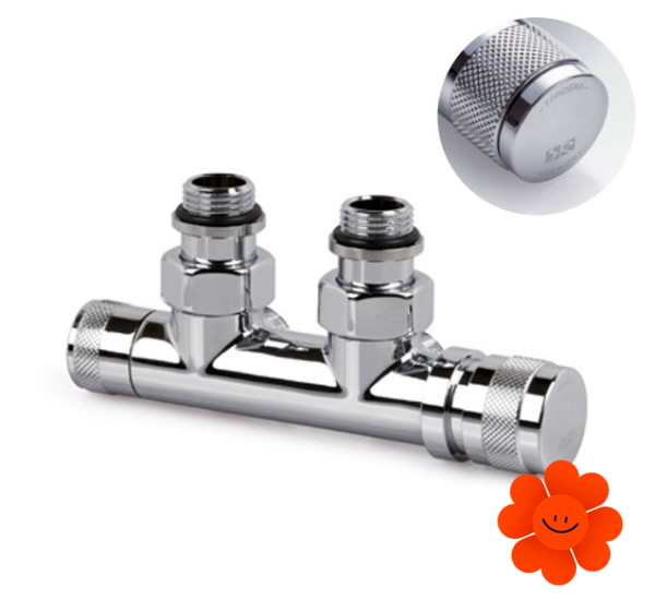 Das Chrom-Set enthält einen Thermostatkopf und ein Eck-Thermostatventil mit dem Mittelanschluss.