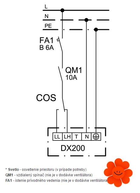 - Radialventilator mit zwei Geschwindigkeitsstufen (100/59 m3/h) (direkte Klemmung bei Montage) - hohe Drehzahl (LH) / niedrige Drehzahl (LL) bzw. mit der Anwendung von Drehzahlregler COS