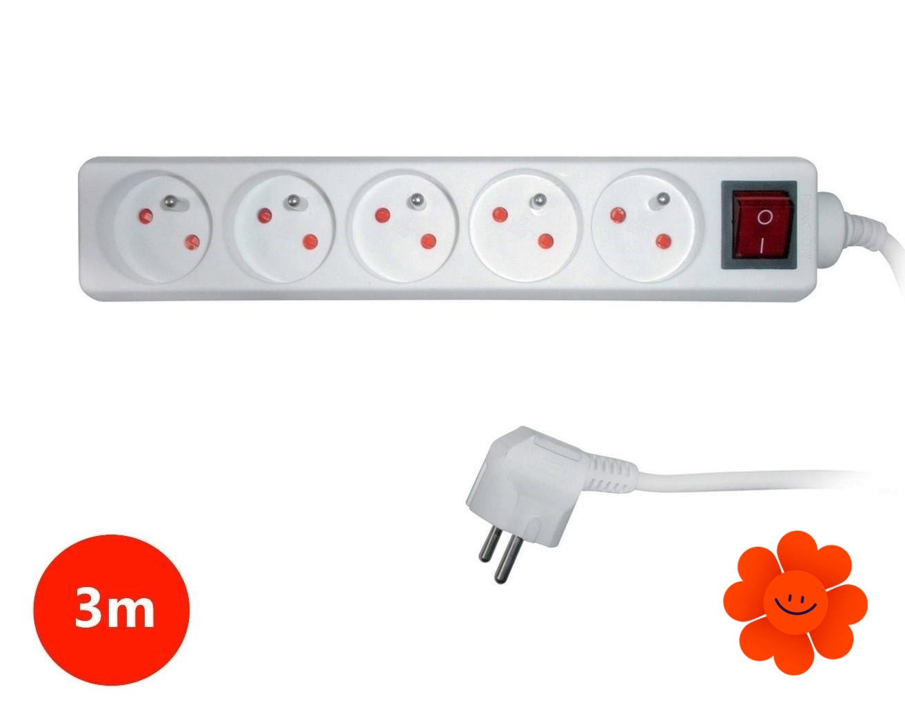 Schnur und Kabel sind weiß mit der Länge 3 Meter, 5x Steckdose mit dem Schalter.