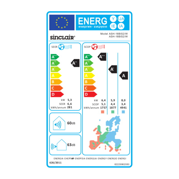 Die Klimaeinheit Sinclair Spectrum Plus ASH-18BIS2/W hat die Kühlleistung 5,3 kW, die Heizleistung 5,6 kW und ist für Räume bis 45 m2 bestimmt.