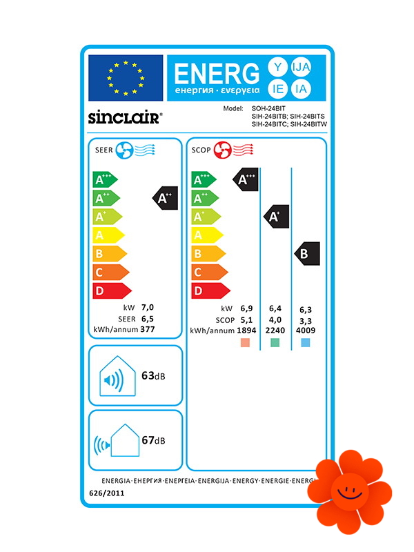 Die Klimaanlage Sinclair Terrel SIH-24BIT2 + SOH-24BIT2 hat die Kühlleistung 7,0 kW, die Heizleistung 7,4 kW und ist für Räume ab 45 m2 bestimmt.