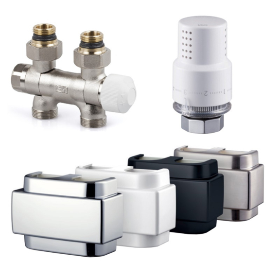 Rechtes thermostatisches Design-Winkelset – Paar 0641+0639+N090 (ein Zuleitungsventil, ein Ableitungsventil, ein Kopf Domus und 2x Gewinde).