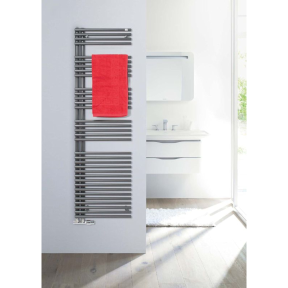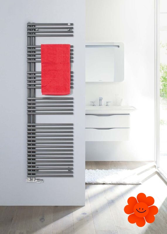 ZEHNDER Forma Asym ist ein stilvoller Badheizkörper mit asymmetrischer Anordnung der einseitig – links oder rechts – offenen Rohre. Dies ermöglicht ein bequemes seitliches Aufhängen und Einschieben von Handtüchern in beliebiger Höhe.